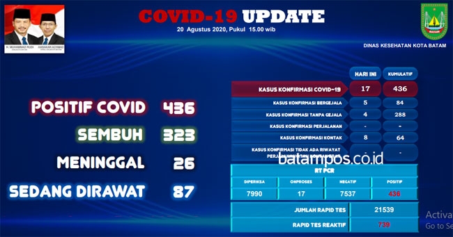 Jumlah pasien Covid-19 di Kota Batam hingga Kamis (20/8/2020).